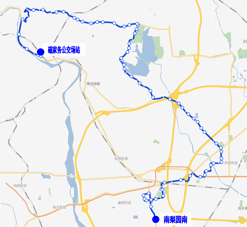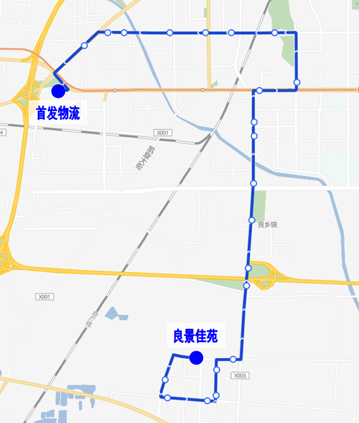 由良景佳苑发出,经阎长路、良窦大街、刘东路、良泽街、阎长路、良常路、长虹东路、揽秀北街、良乡东路、良乡中路、良乡西路、月华南大街、星光路、长虹西路至首发物流。