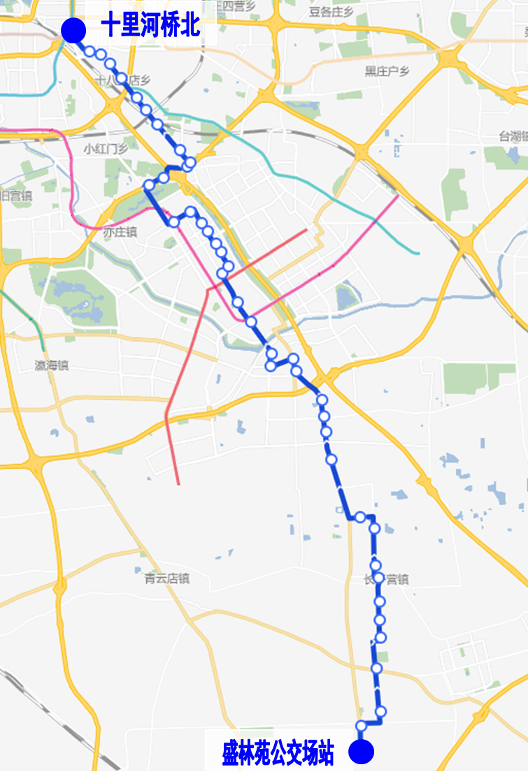 取消站位:潘家园桥北、双井桥南、大北窑南;开往盛林苑公交场站方向“十里河桥北”站移至三环辅路。