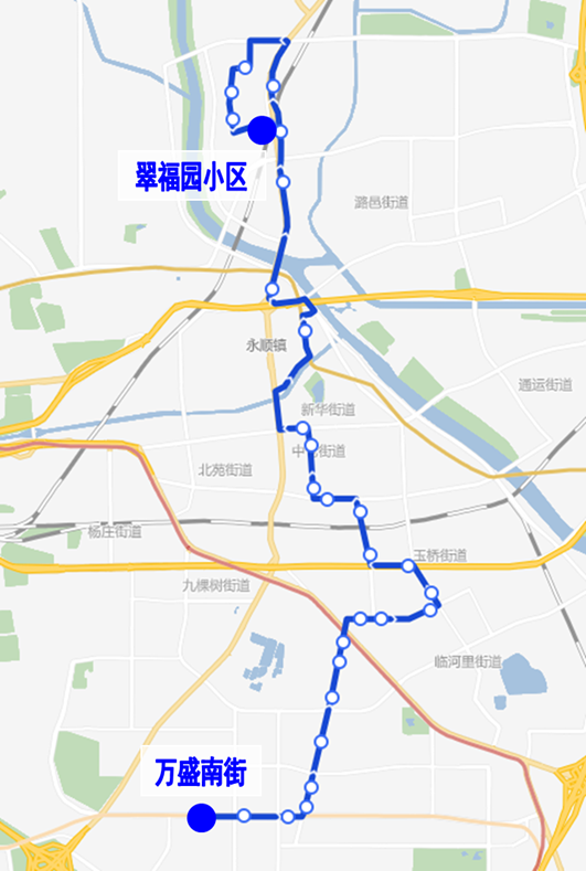 增设站位:万盛南街、日新路口西(开往万盛南街方向)、日新路口东(开往翠福园小区方向)、地铁万盛东站、大马庄南站、大马庄、群芳园、云景里、云景东路、杨家洼路口南、梨园北街西口、玉桥西里、梨园东里北区、玉桥南里、通州交通队、艺苑东街西口、通州南关、通州南关西、通州车站路口北、中仓;取消站位:古城西桥公交场站-新华大街沿途各站。