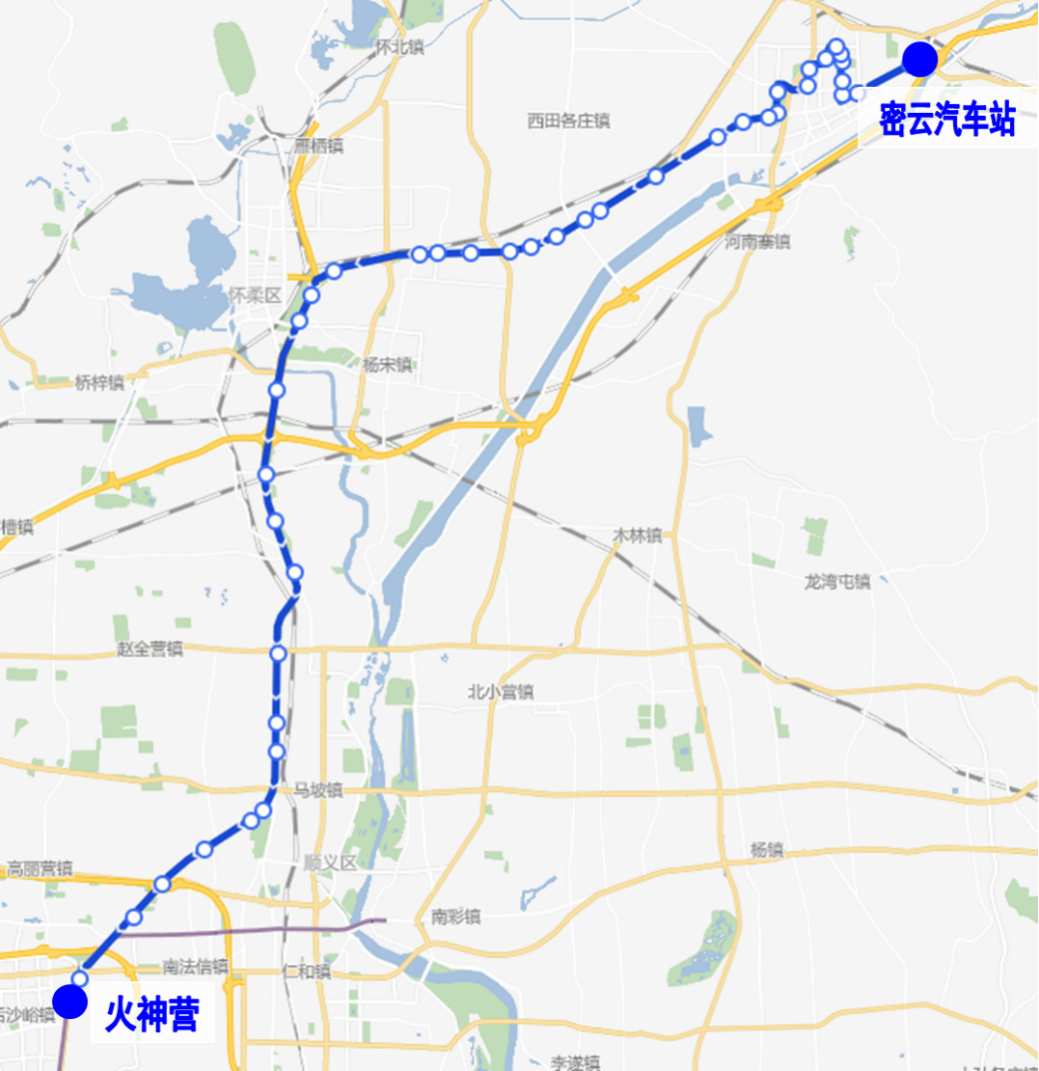 由南彩汽车站发出,经顺平辅线、府前街、府前西街、顺于路、南焦路、顺平路、京密路、火沙辅线、双裕街、裕丰路、双裕北街、天北路、机场北线南路、高白路、顺于路、英才北三街、未来科学城路、英才南二街、未来科学城东路、鲁疃东路至未来中心公交场站。