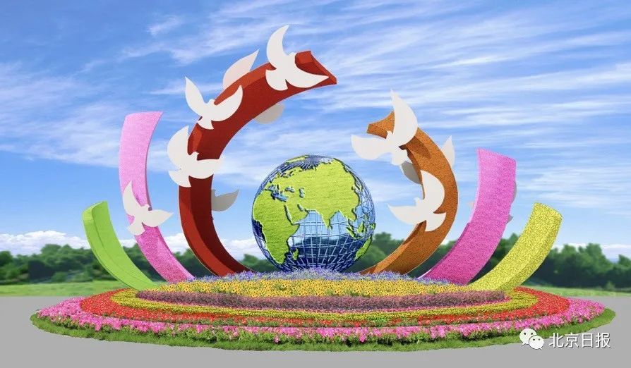 军事博物馆前广场是“命运共同体”花坛,顶高9米,以地球、和平鸽、飘带为主景,寓意深化全球发展合作,共创共享和平繁荣美好未来。