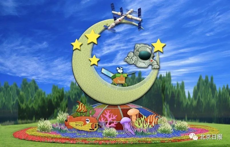 东单东北角布置的是“创新发展”花坛,顶高9.5米,以宇航员遨游太空和海斗号探索海洋为主景,配以中国空间站、玉兔号月球车等,寓意全面贯彻新发展理念,深入实施创新驱动发展战略,加快建设科技强国,实现高水平科技自立自强。