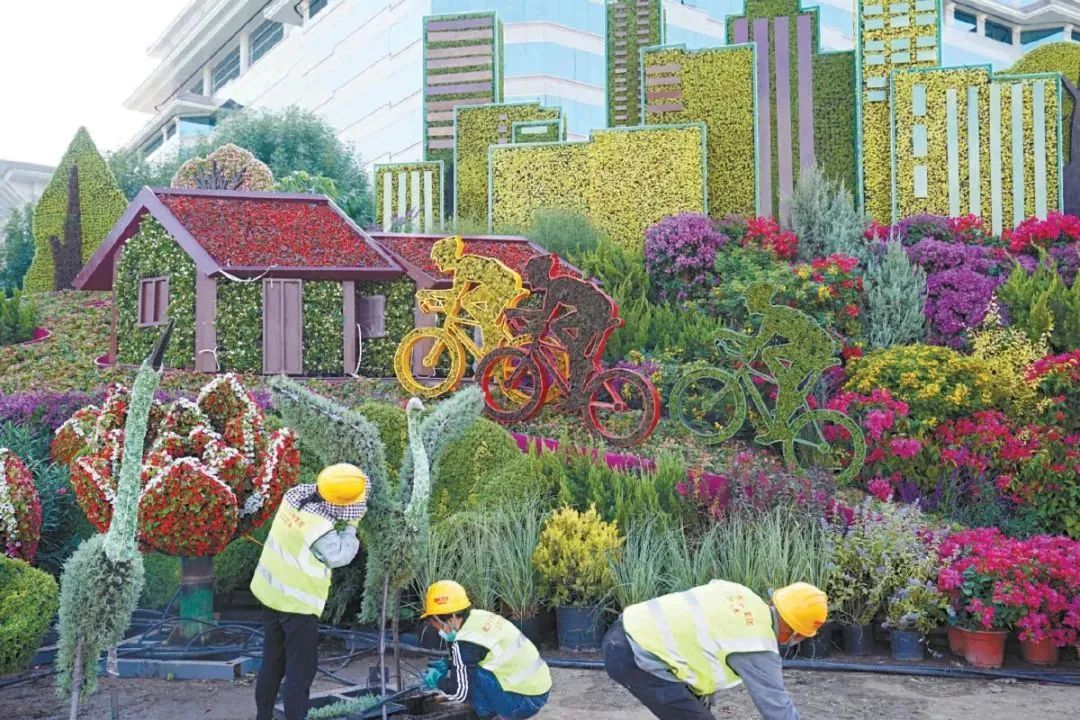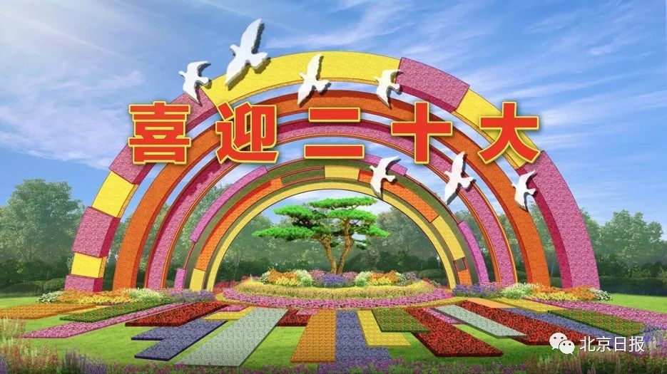 在地铁永安里站附近的双子座大厦,“喜迎盛会”花坛顶高七米五,以彩虹门为主景,镶嵌有“喜迎二十大”组字,烘托喜迎盛会的喜庆氛围。党的二十大会议期间,“喜迎二十大”将更换为“喜庆二十大”。