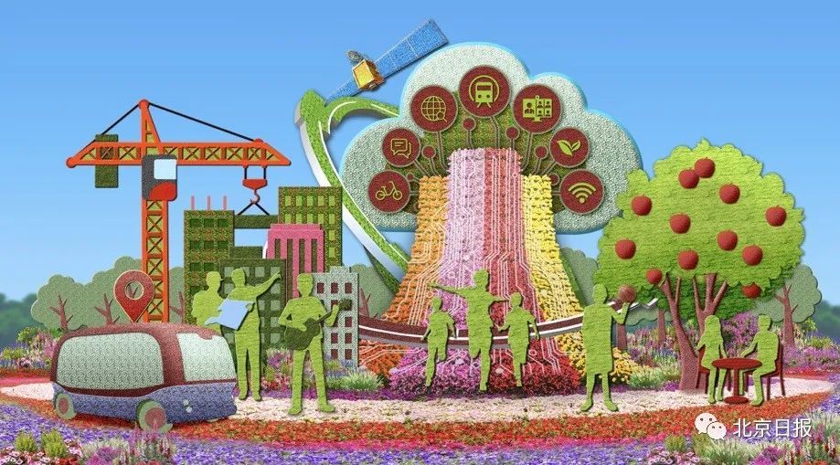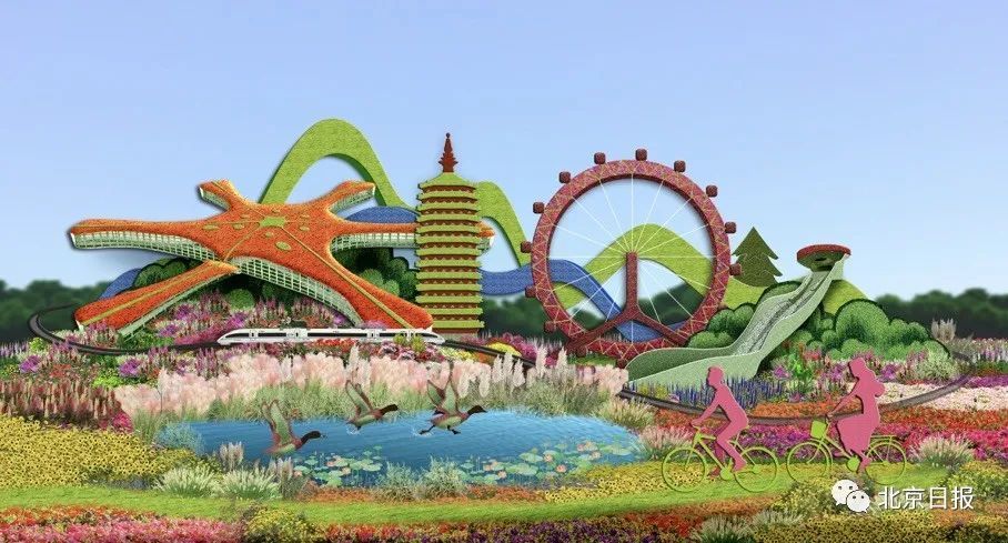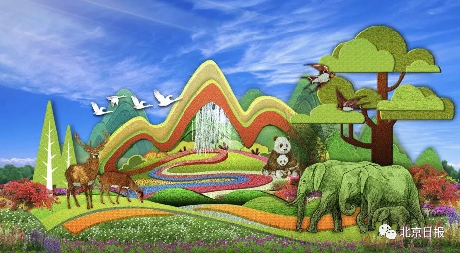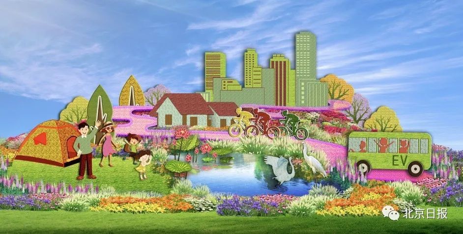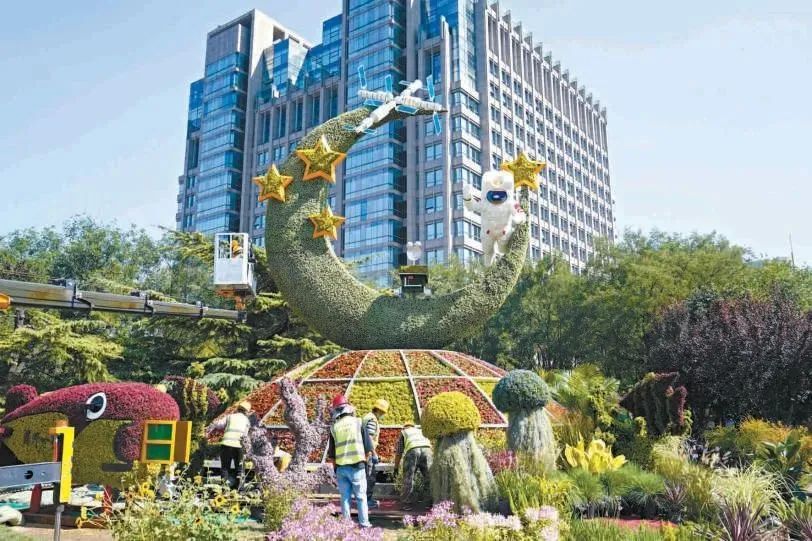 长安街南侧的长安大厦将布置“绿色发展”花坛,顶高8.5米,以祖国的锦绣河山为场景,体现了生态优先、绿色发展的美好景象,寓意绿水青山就是金山银山。
