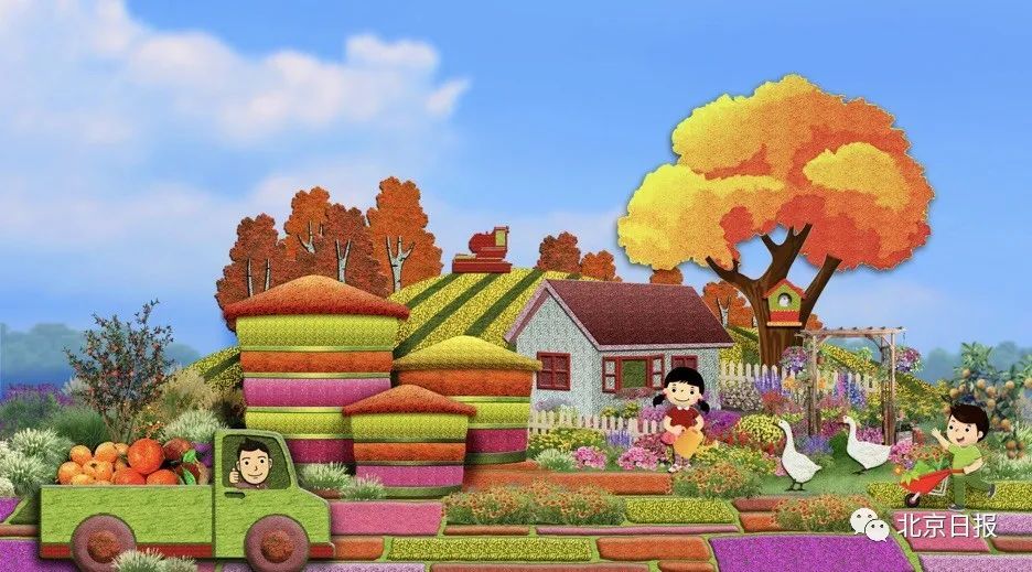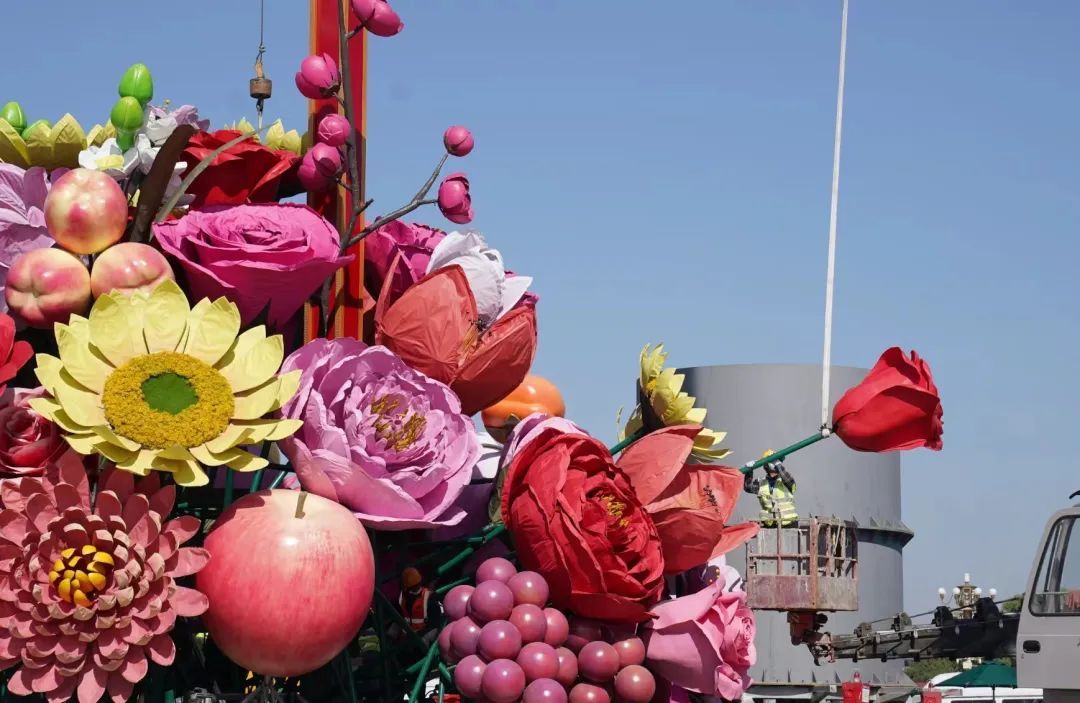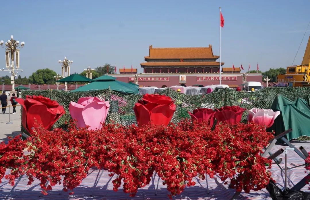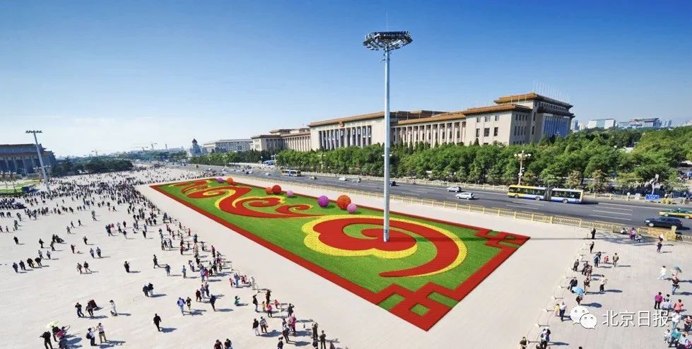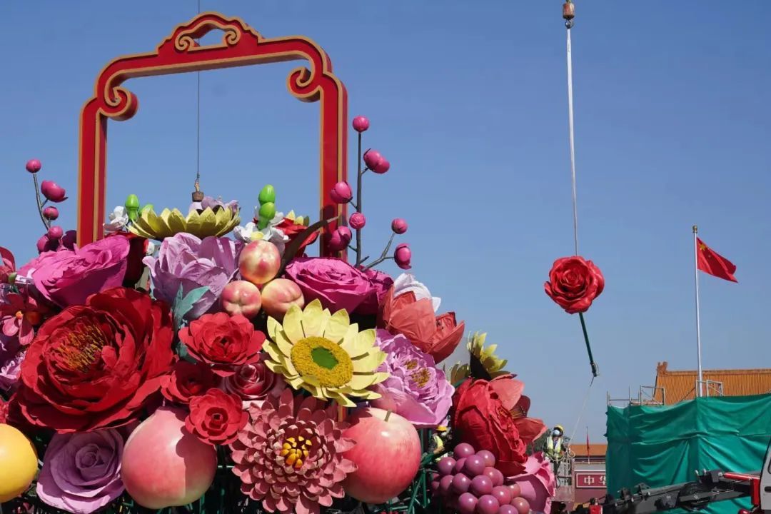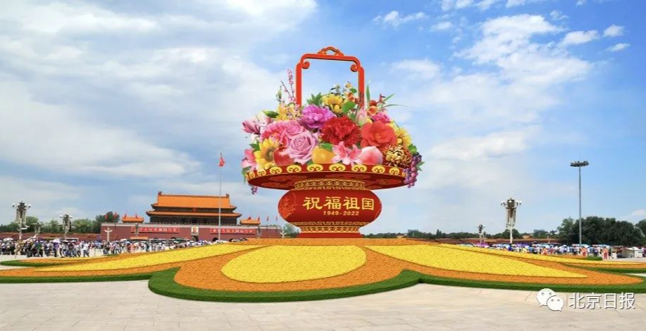 在天安门广场的中心区域,将以喜庆的“祝福祖国”巨型花果篮为主景。汇聚花的美丽和果的喜悦,顶高18米的花果篮,主花材选取了十种花卉和十种水果,象征十全十美,体现花团锦簇、硕果累累喜迎二十大的美好寓意。