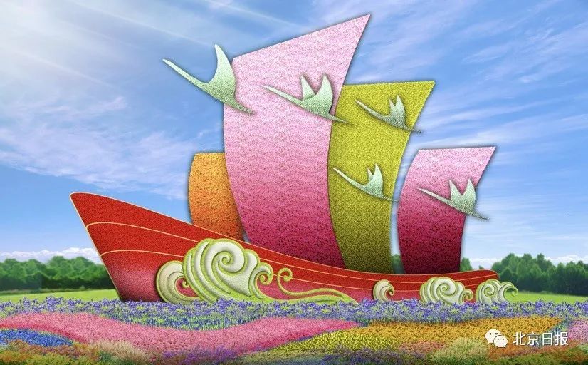这个花坛的主题与地名太搭配了!“伟大复兴”花坛顶高8.5米,以乘风破浪的帆船为主景,寓意扬帆起航,开启全面建设富强民主文明和谐美丽的社会主义现代化强国,实现中华民族伟大复兴中国梦的壮丽篇章。