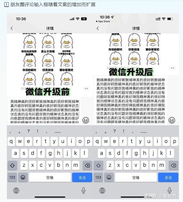 微信朋友圈扩展文字输入区域:发朋友圈或朋友圈评论时,编辑文案,文本区域会随文字数量而增大。
