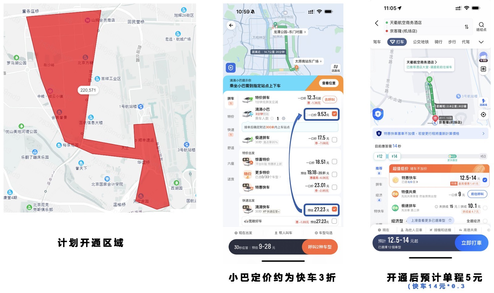 经过工作组、机场街道多次共同调研,认为相比于网约车的纯市场驱动和公交车的高度计划性,滴滴小巴这种改造“公交1块钱,打车10块钱”之间的市场空间的定位,恰好能够为机场地区提供便捷的短途出行服务。