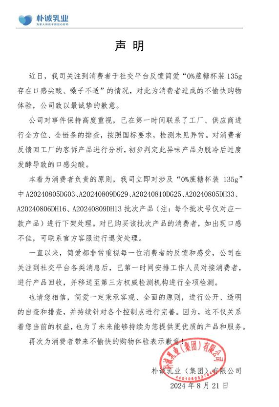 号称“零添加”的酸奶品牌“简爱”近期被多位消费者反映酸奶“有股消毒水味儿”、“吃了辣嗓子”,有的消费者食用后出现呕吐、腹泻症状。对此,简爱所属公司朴诚乳业8月21日发布声明说,与相关工厂和供应商进行了全面的检查和排查。所有产品均按照国家标准进行了检测,结果显示并无异常。初步确定产品出现的异味可能是由于产品在脱冷后过度发酵,导致口感出现尖酸。并且表示对相关批次产品下架召回,承诺给消费者退货。