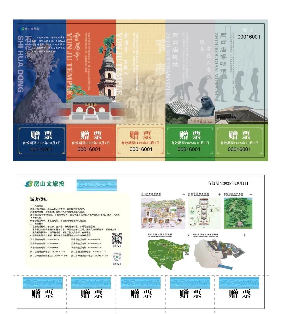 本赠票可替代下列景区(点)门票参观该景区(点),每张对应景区(点)限一人使用一次,赠票有效期至2025年10月1日。票面景区(点)为:石花洞、云居寺、石经山、周口店遗址、周口店博物馆。
