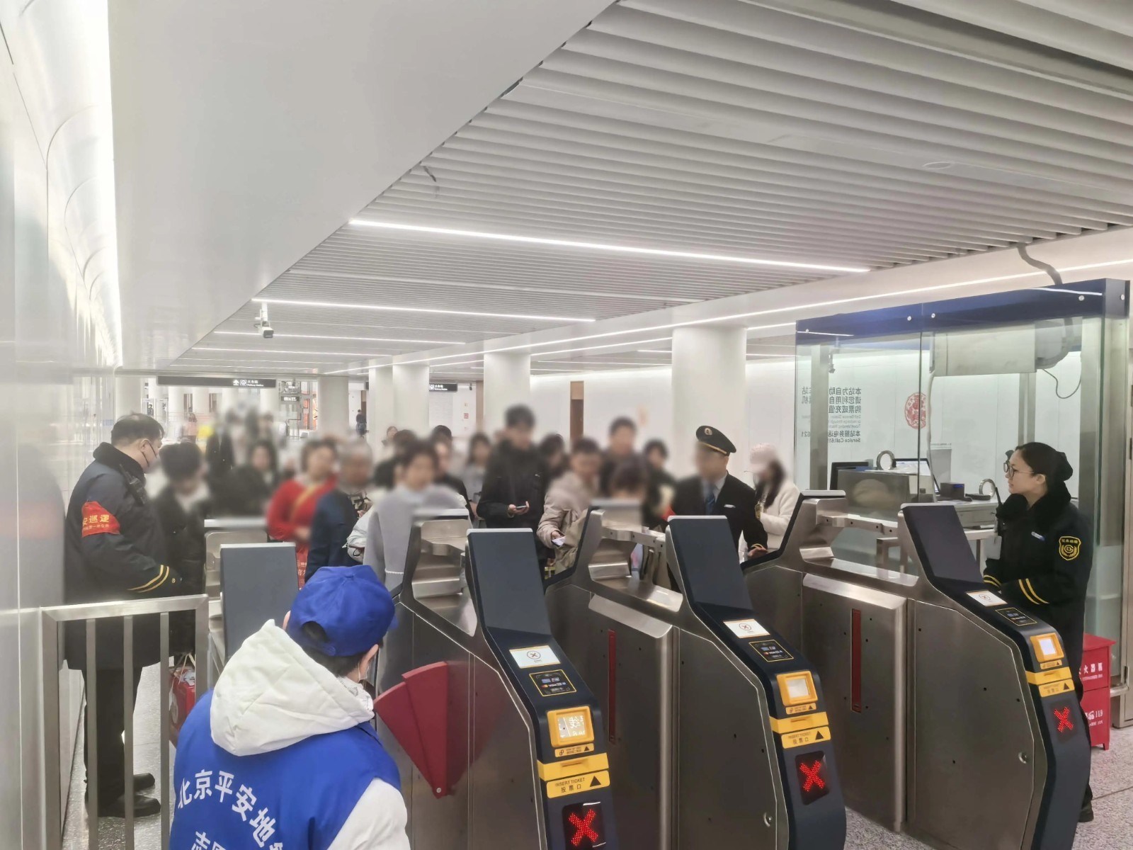 与北京站接驳的地铁2号线部分区段采取延时运营、提前开门措施。地铁北京站在进站口、换乘通道增设导流围栏和导向标识,启用全部闸机及安检通道,分区导流提升通行效率。党团员组成志愿服务队,并接收邻近车站支援人员,设置“返程服务台”,提供热水、应急药品、捆扎绳、胶带等,为老年、母婴旅客提供优先通行和行李帮扶。站内新春展板邀您打卡留念。