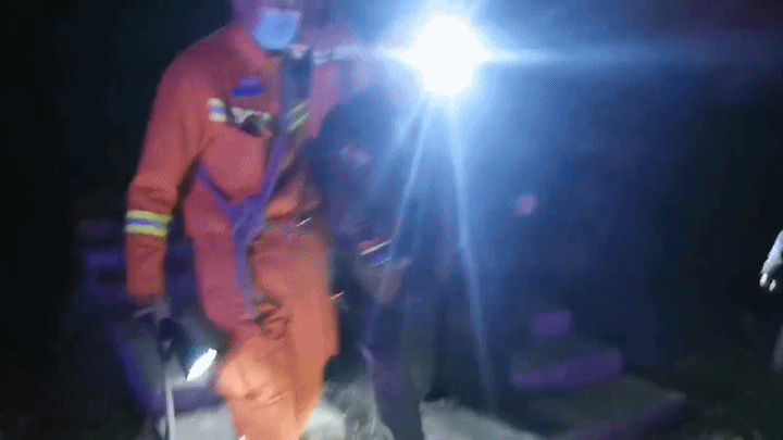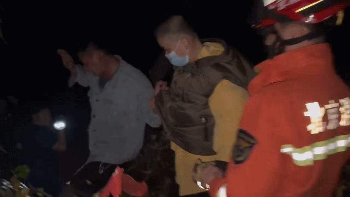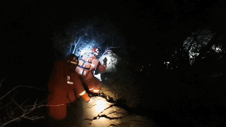 黑夜里,消防救援人员连续喊话判断老汉方位,并以山下消防车上的照明灯为参照物,利用强光手电光束报告所在位置及搜救进度,经过1个多小时的搜寻找到被困者补充食物和水后安全转移至山下。