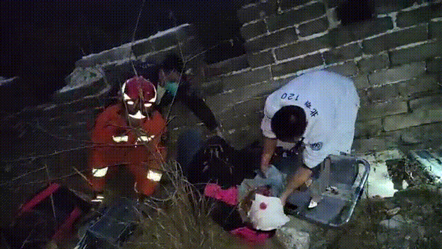 消防救援人员将被困男子抬至卷式担架,并安抚受伤人员,后将之从长城上抬至山下,交接给120。