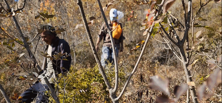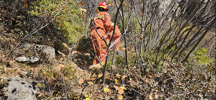 2022年10月23日晚密云区北庄镇某处山上66岁患有高血糖老汉上山砍柴失联。消防救援人员在密林中开路前进。