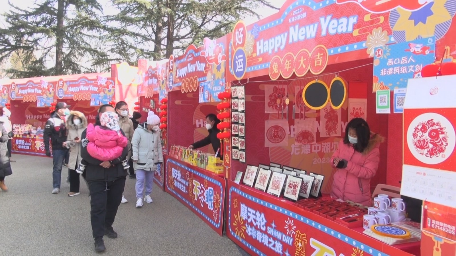 除了冰雪世界之外,在龙潭中湖公园的湖心岛上,摩天轮下,风车、皮影、糖人、面塑、内画、剪纸等传统非遗与儿时玩具悉数亮相;国家地理、南锣书店、盲盒、吃鱼定制等品牌文创好物琳琅满目;冒险、赛车、射击等VR互动体验项目新奇震撼。传统文化、当代文创与现代科技为广大游客带来了丰富多彩的新春游览体验。