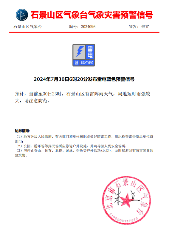 石景山区气象台2024年7月30日6时20分发布雷电蓝色预警信号;预计,当前至30日23时,石景山区有雷阵雨天气,局地短时雨强较大,请注意防范。