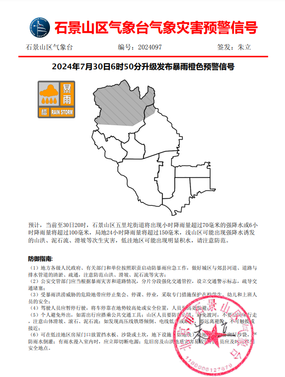 石景山区气象灾害预警中心2024年07月30日06时50分升级发布暴雨橙色预警信号:预计,当前至30日20时,石景山区五里坨街道将出现小时降雨量超过70毫米的强降水或6小时降雨量将超过100毫米,局地24小时降雨量将超过150毫米,浅山区可能出现强降水诱发的山洪、泥石流、滑坡等次生灾害,低洼地区可能出现明显积水,请注意防范。