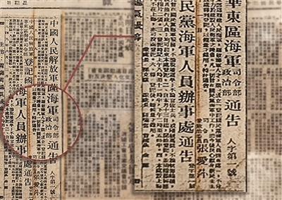 在海军东海舰队军史馆陈列的《大公报》上,刊登着人民海军的第一号文件。