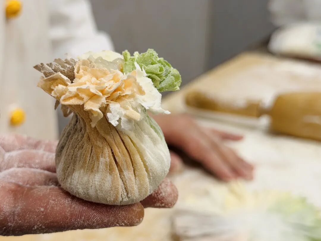 包烧麦也是有技巧的,搁在手心里边,包的是福气,面边聚到一起了,聚的是财气,就像一个小福袋。“我们的金鼎烧卖就是三鲜的,里面是海米、海参、虾仁等。还有彩绚烧卖,5个颜色一起,过年吃这个烧卖,就像大家伙团聚到一起一样的。”