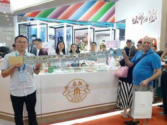 《红旗渠》个性化小本票采用国画的描绘笔法、连票的设计形式,总长度达2.7米,赢得了众多邮迷的关注和喜爱。一位外国邮迷在了解了红旗渠的历史后购得一套,并高兴地在展区前和工作人员拍照留念。