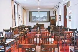 如今,教室的讲台上,摆放着一盒满满的白粉笔和黑板擦。前两排桌椅是深棕色的椅子配“箱式”桌子,再往后几排都是普通木椅,一端扶手设计成小桌板造型,方便学生记录笔记。朱宁说:“这间教室最多可以容纳76人。”