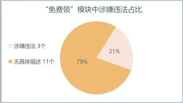 14个电商平台App“免费领”模块中,有3个对中奖产品的售后服务规定涉嫌违法,占比21%。