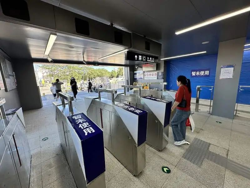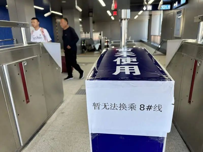 刚一走进出入口就能看到改造后的变化。在下行电梯外,新加装了多台检票闸机,不过它们并没有开启,在检票闸机上还贴有“暂未使用”的标识。地铁站C口内的一侧依然立着施工围挡,同样张贴有“暂未使用”的标识,在旁边的立柱上也贴着提示——暂无法换乘8号线。据了解,这些改造的目的是将C口内的安检和检票环节前移至地面层,在C口进站后可以直接选择前往8号线或者10号线。