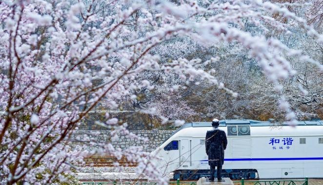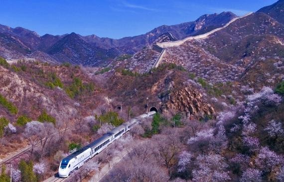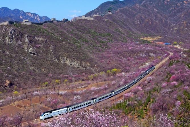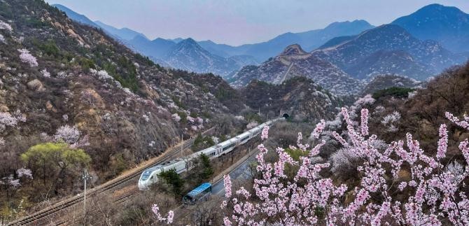 S2线列车在长城脚下呼啸而过,山花、长城、列车,形成了一幅独属于京城的壮美画卷。
