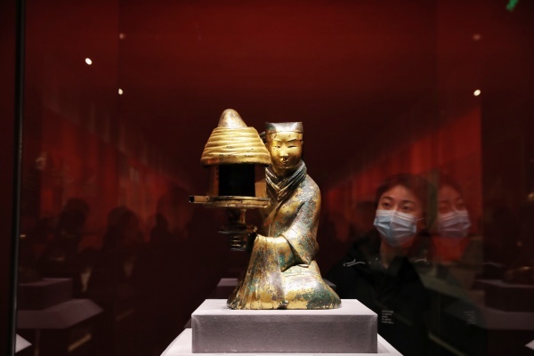 1月25日,观众欣赏汉代的长信宫灯。中国日报记者 姜东 摄