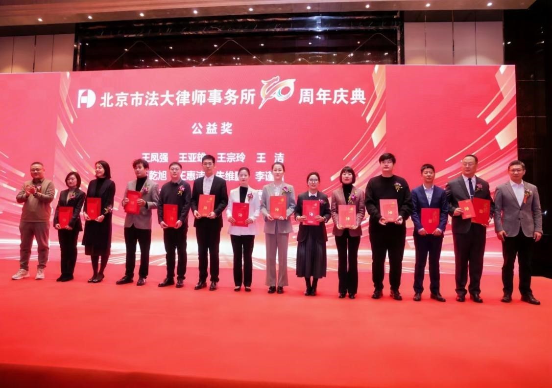 (荣获法大所公益奖律师上台领奖,毕文强监事长和李恩泽秘书长颁奖)