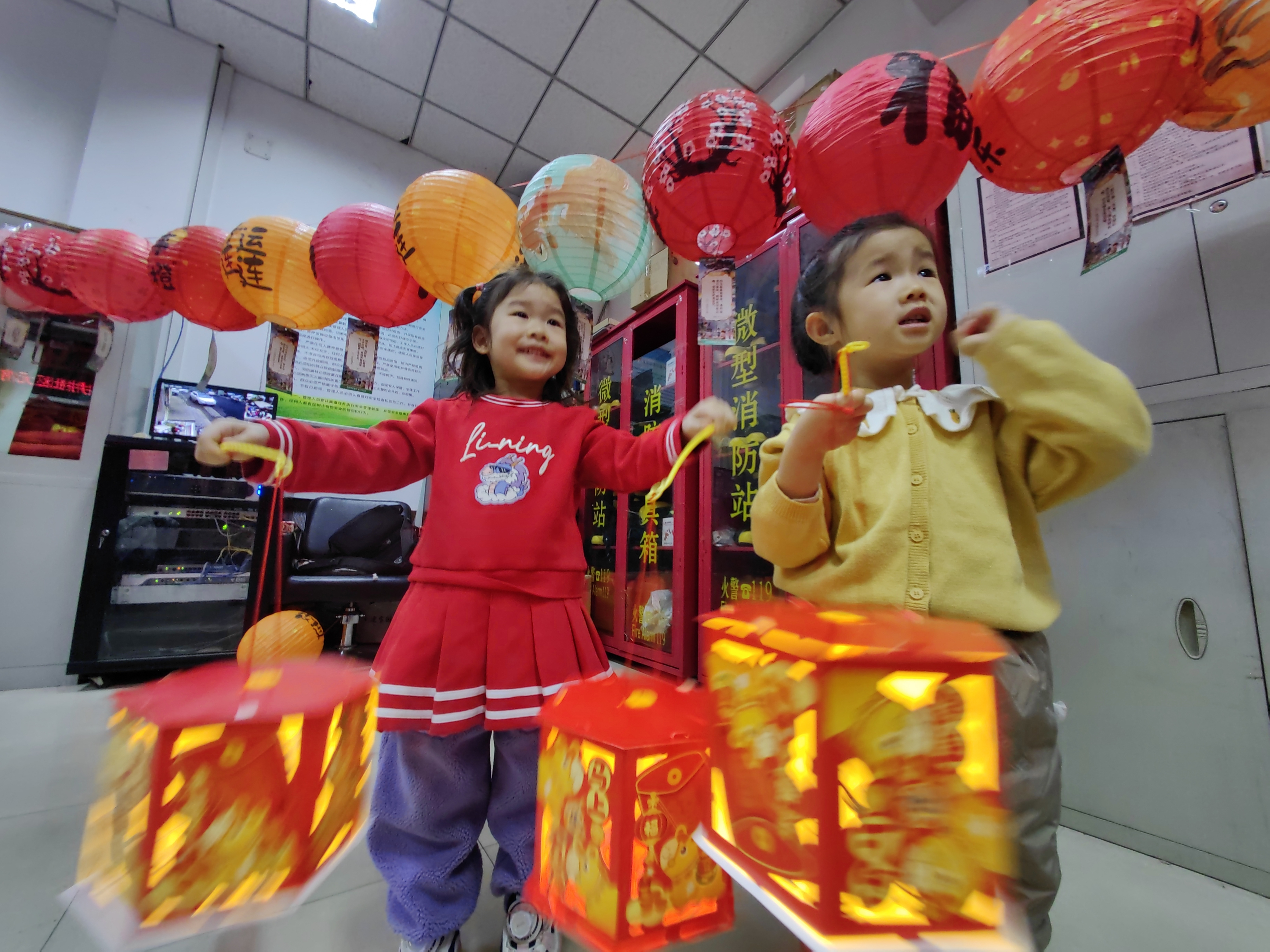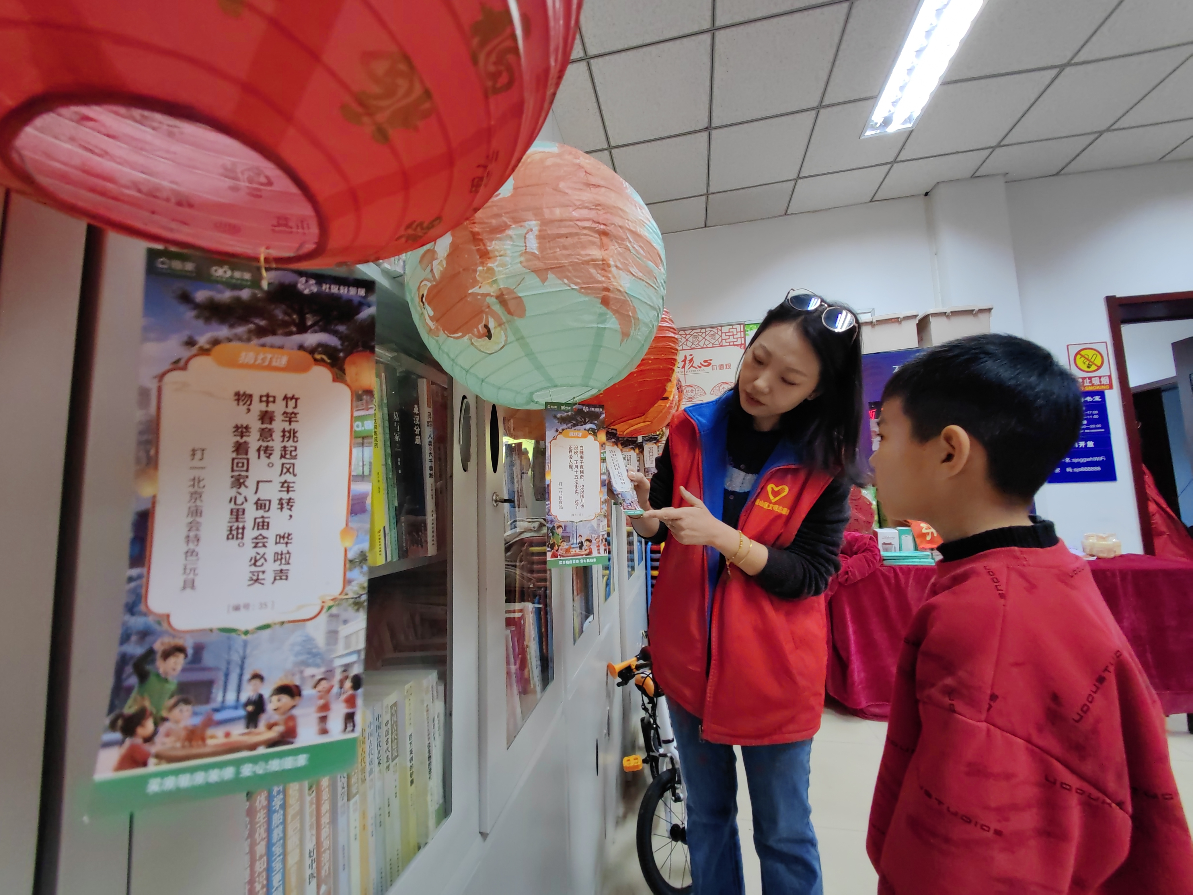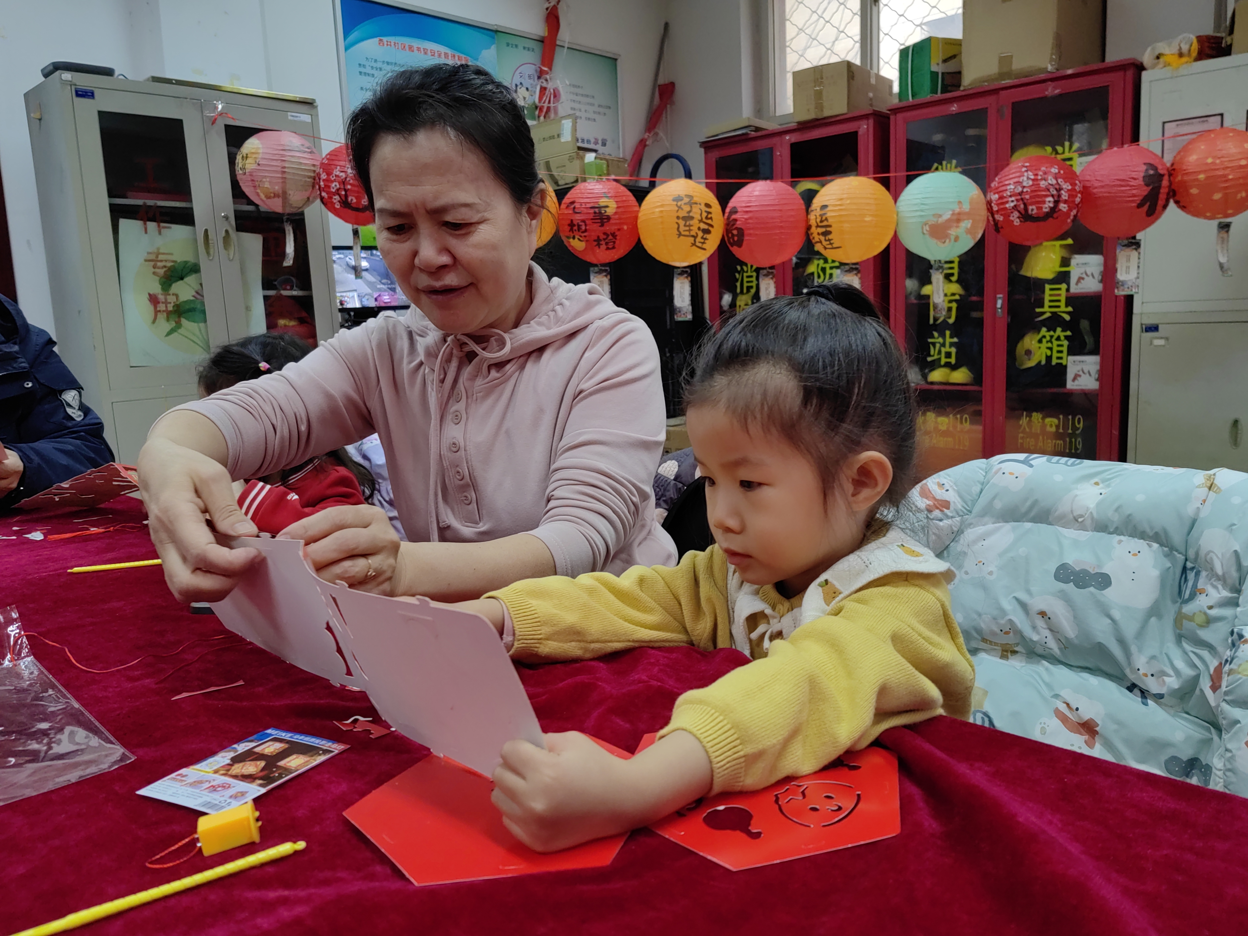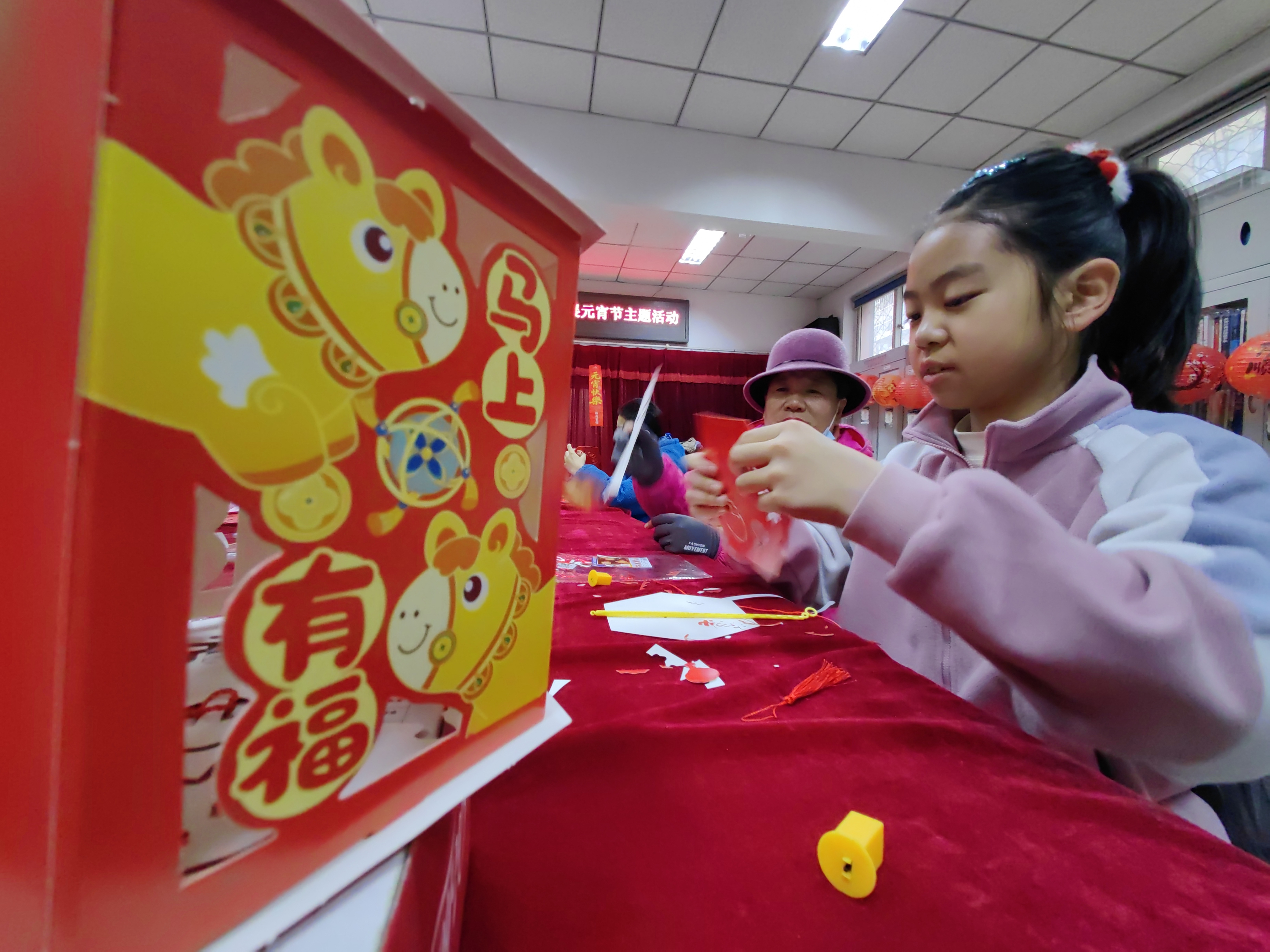 而灯笼区便是亲子家庭的乐园。志愿者详细讲解了生肖马灯的制作步骤,从折叠、粘帖到装饰,每一步都耐心指导。孩子们在家长的陪伴下,用稚嫩的小手认真创作,一张张红纸在大家的巧思下变成了一盏盏精致的灯笼。孩子们提着自己制作的灯笼相互展示,开心溢于言表,现场充满了童真与暖意。