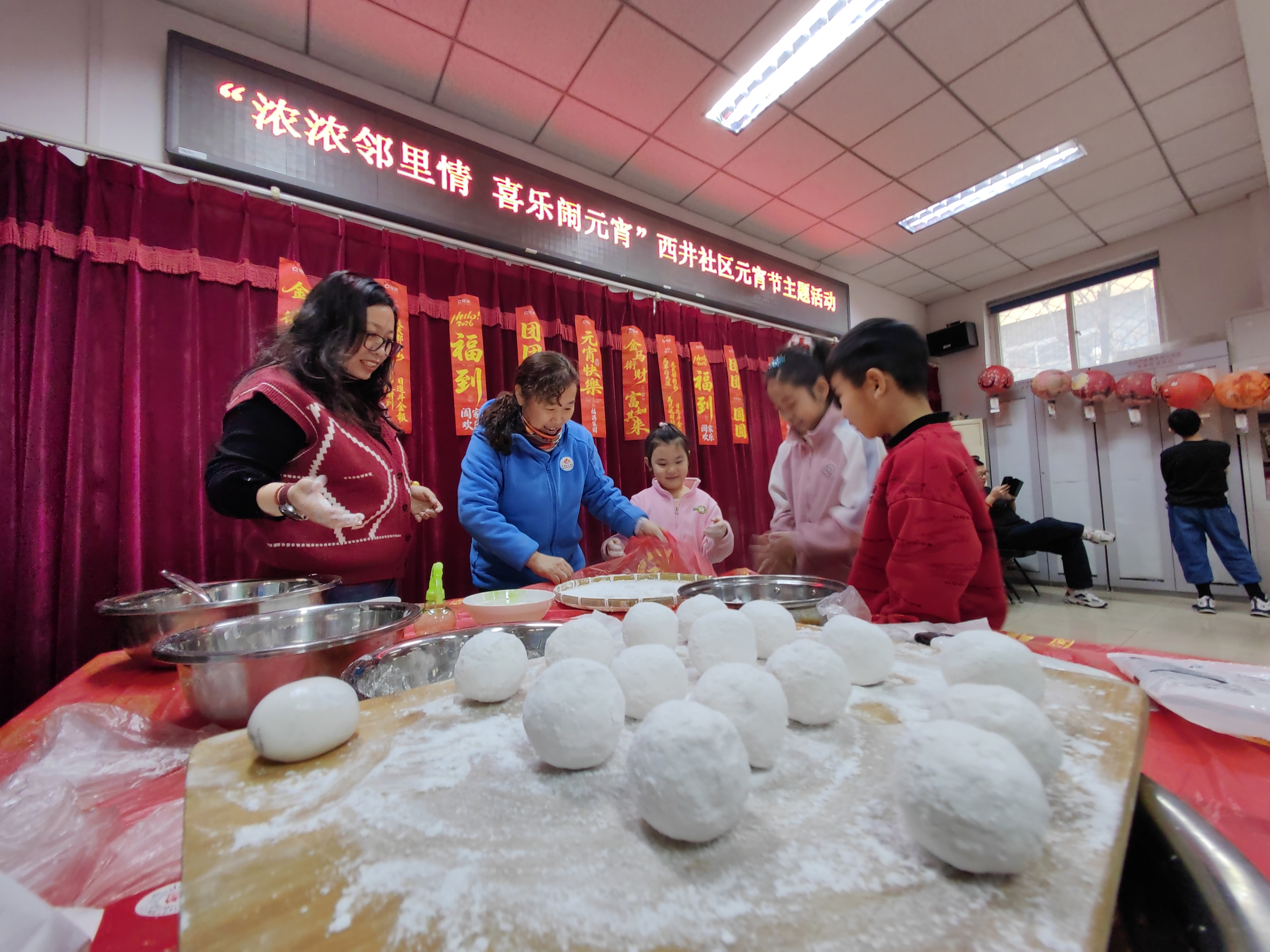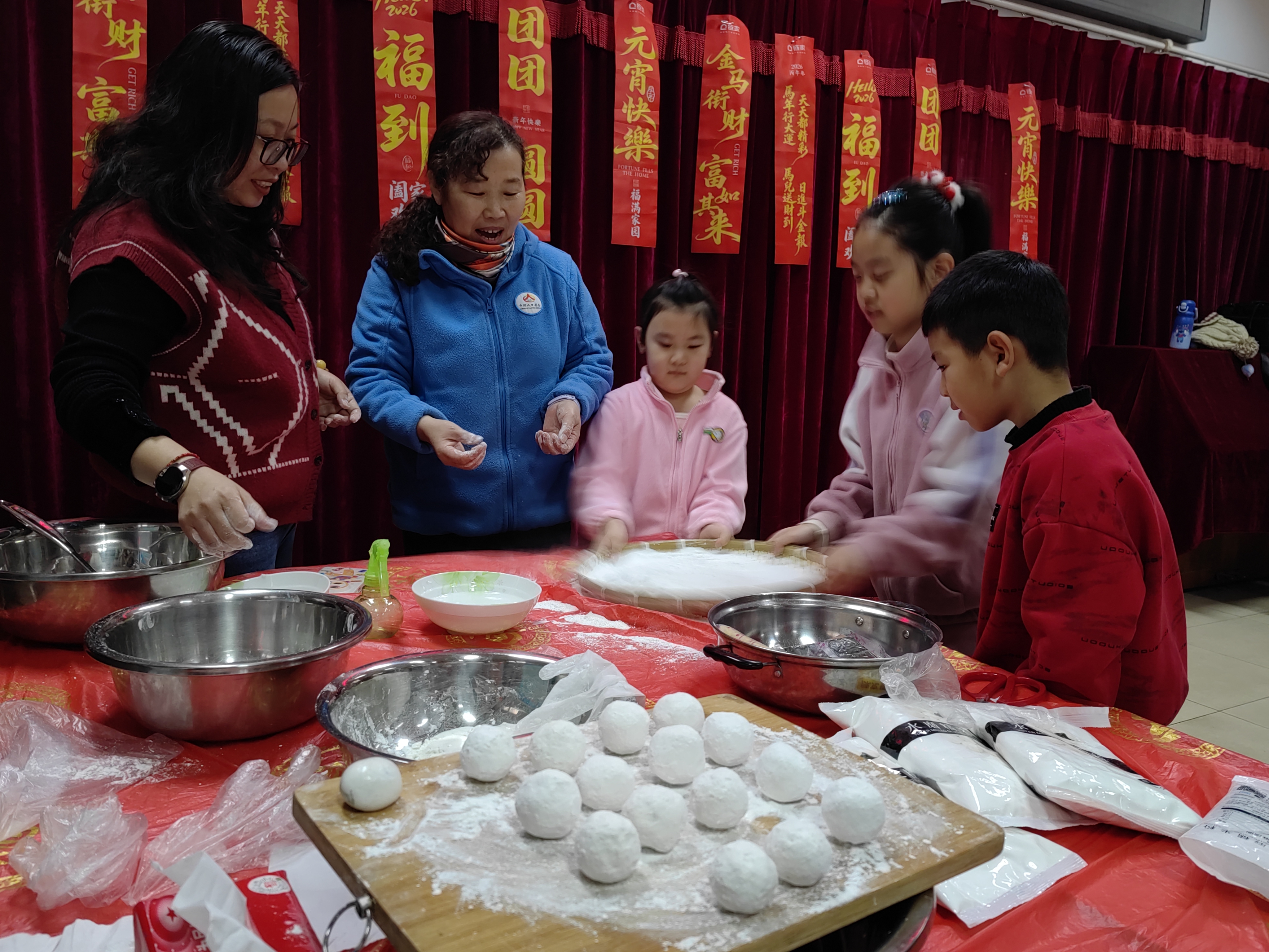 元宵象征着团圆、幸福、美满。在志愿者的示范下,大家纷纷挽起袖子,将馅料沾水放入装满糯米粉的笸箩中,有模有样地摇晃起来。“馅料蘸水要均匀,滚粉的时候力道要巧,这样摇出来的元宵才又圆又瓷实。” 经验丰富的李阿姨一边摇一边向身边的年轻人传授技巧。随着一颗颗洁白圆润的元宵在手中逐渐成形,空气中弥漫着浓浓的糯米香和甜蜜的节日气息。随后,社区工作人员将摇出来的元宵煮熟,一碗碗热气腾腾的元宵送到居民手中,大家品尝着自己的劳动成果,甜在嘴里、暖在心里 。