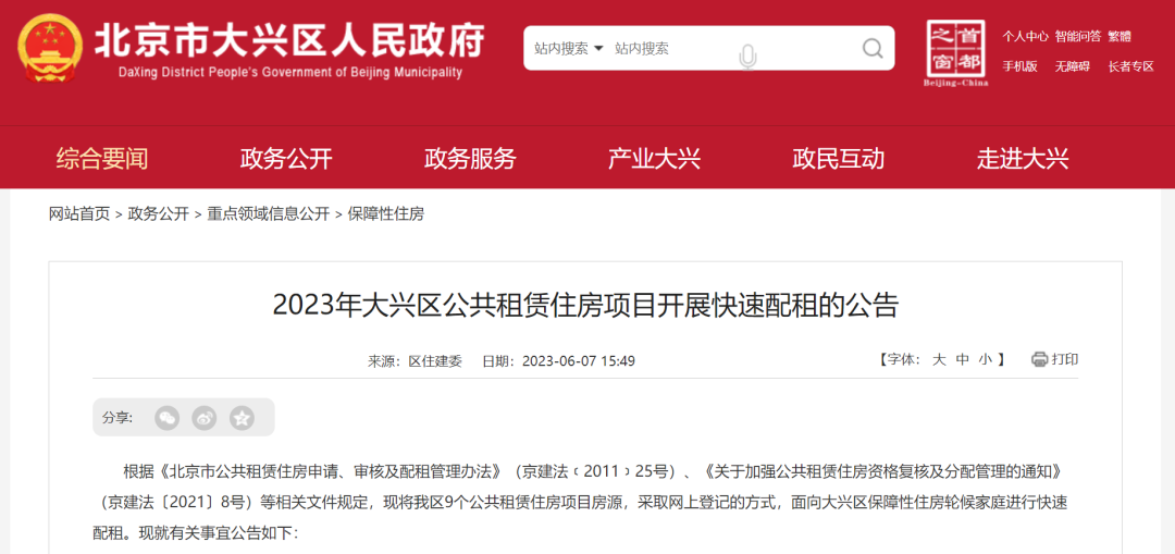 6月7日,大兴区住建委发布《2023年大兴区公共租赁住房项目开展快速配租的公告》。