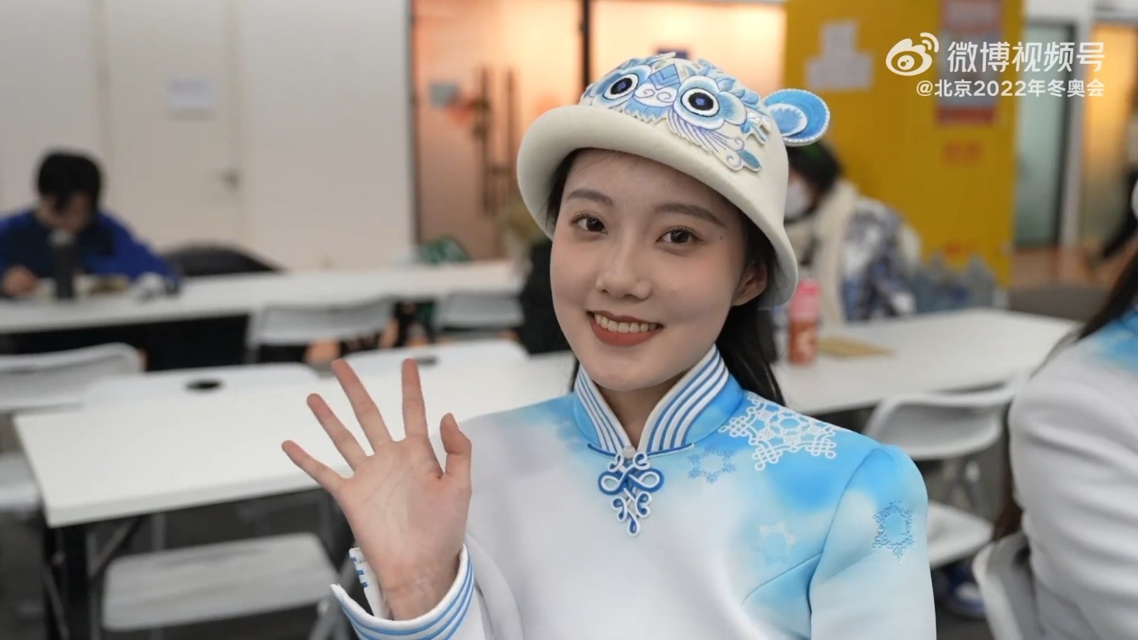 ②虎头帽。引导员的服装设计采用冰雪图案和中国国画的风格。值得一提的是,每位引导员头上斜戴一顶小帽子,均采用来自河北民间的传统虎头图案和两只竖起的耳朵,俏皮可爱。2022年是中国农历的“虎年”,传统中人们习惯在虎年给孩子们戴虎头帽。虎头帽一共有7种图案。