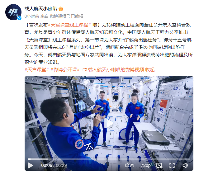 中国载人航天工程网官微@载人航天小喇叭5月18日首次发布《天宫课堂》线上课程系列,第一节课为大家介绍“载荷出舱任务”。