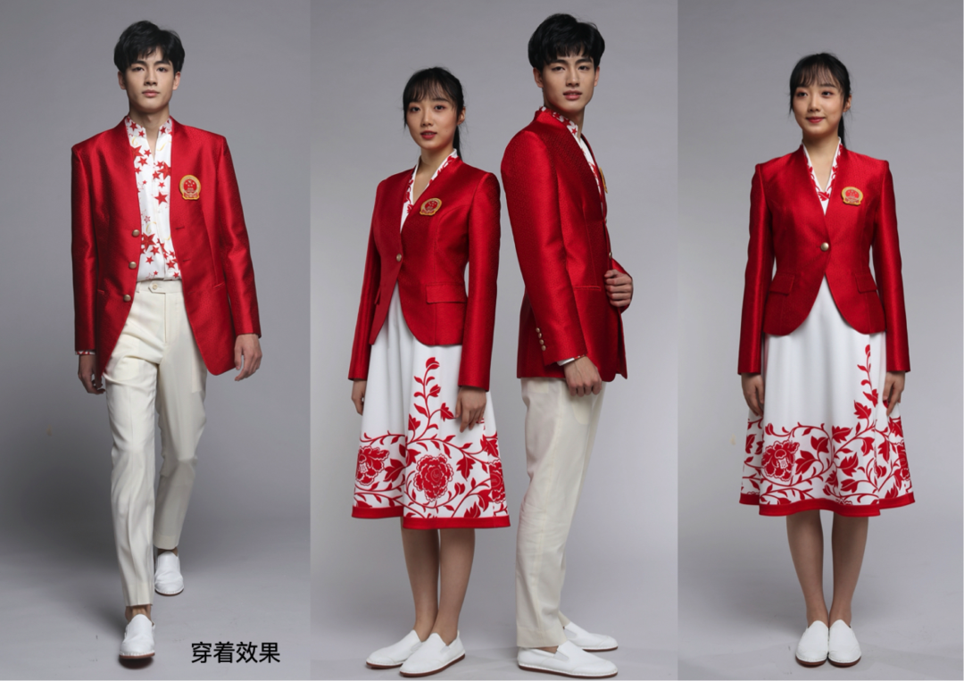 运动员出场是大家关注的焦点,远远走来的运动员方阵,首先应该从色彩上具有可识别性,所以红色是首选色彩。红色是国旗的主色,也是中国传统礼仪最高等级的色彩之一,是华夏衣冠大国所具有的礼仪与文明的体现。在重要庆典与日常喜庆的时刻,红色都是人们最喜闻乐见的色彩。