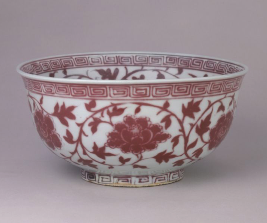 色彩可以传达出一个民族的视觉特性,加上民族的图案,会更加准确地表达属于中国的信息。牡丹花是中国的国花,选取故宫明代洪武“釉里红缠枝牡丹碗”上的纹样作为视觉来源,具有中国特有的美学品质和趣味。图案经过重新归纳后,简洁明快,保留了原图案的典型特征。设计组合成适合女装白色连衣裙下摆的图形,领口露出的牡丹枝叶起到上下呼应的作用,层次更加丰富。