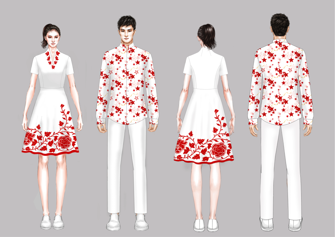 男女装上衣为“V”领西服,男装采用直线风格,女装采用曲线风格。男衬衣立领与女装连衣裙领口设计语言相同,都是有开口的样式,可以衬托脸型,也通风凉快。