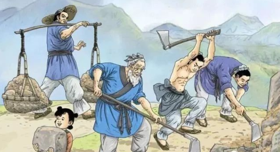 愚公就挑了三个比较能够挑负重担的子孙,跟着他一起去凿石头、挖泥土,然后他们把挖下来的土石,用畚箕运到渤海的边上。