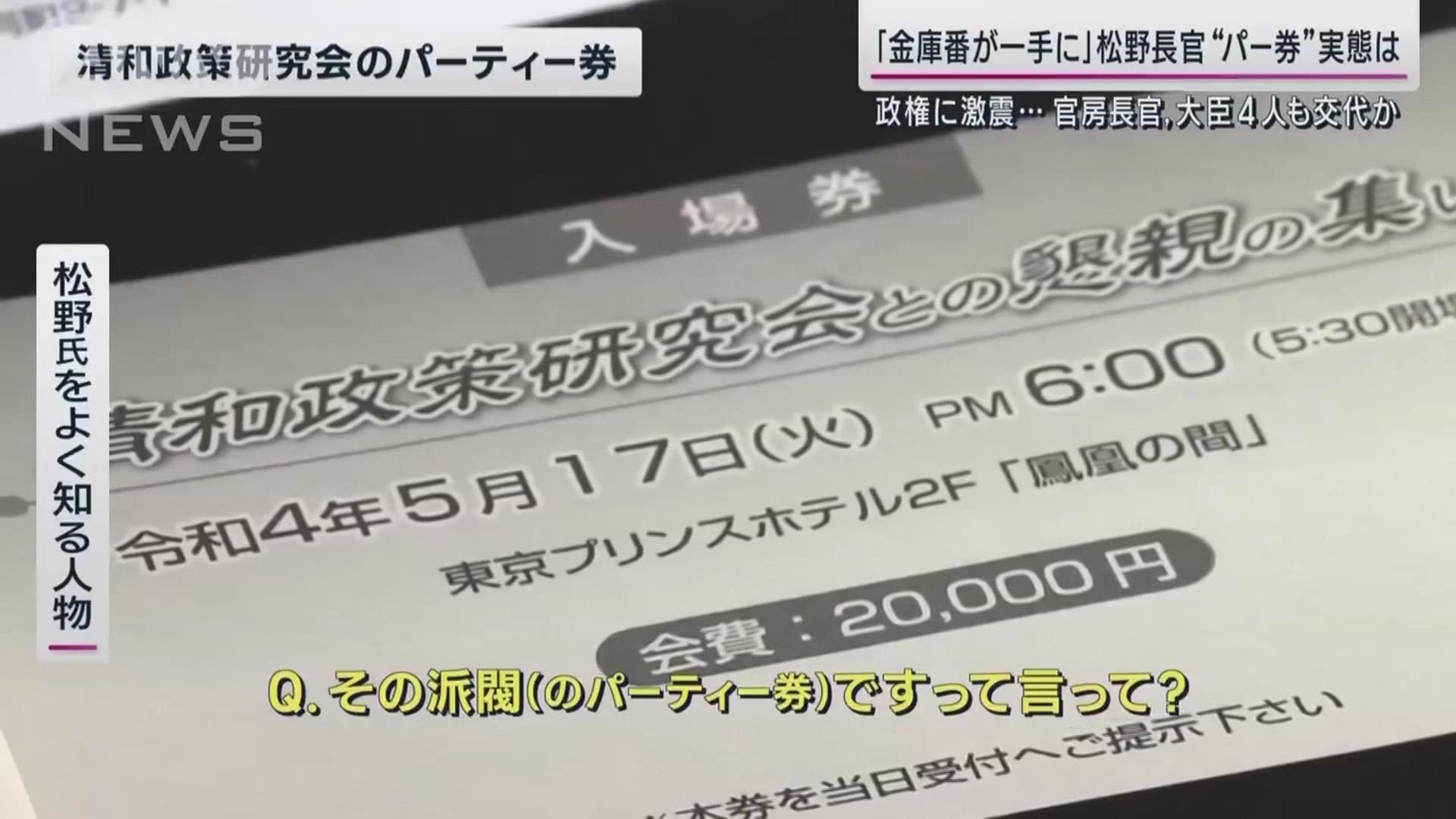 对前内阁官房长官松野博一、前总务大臣武田良太等人给予“停止党内职务一年”处分。此外,未申报金额在1000万日元至2000万日元的党员将被给予“停止党内职务半年”处分;超500万日元但不足1000万日元的议员,给予“警告”处分。