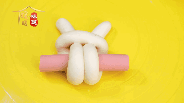 别看造型突出就以为难,实则超简单!面团发完后排气,分成小剂子搓成长条就行,放根香肠,将两头长条绕着香肠塞回去,就是兔子的雏形。