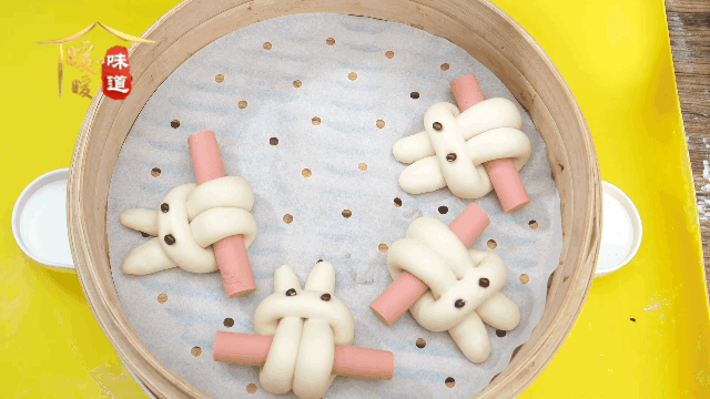 二次发酵:蒸屉里垫一张蒸布或蒸纸,放入制作完的兔子肠仔包,盖上盖子放在不开火的温水蒸锅上,二次发酵至2倍大。