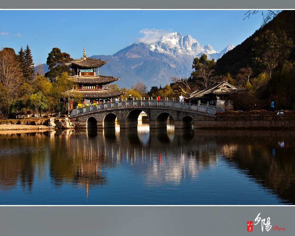 [40]【沫若撰联,黑龙潭陡添神韵;艺谋作导,实景剧再现风情】沫若:即郭沫若。1963年,郭应邀为丽江黑龙潭撰写了对联:“龙潭倒映十三峰,潜龙在天,飞龙在地;玉水纵横半里许,墨玉为体,苍玉为神”,此联抓住了丽江玉泉风光神韵,把玉龙山、玉龙水写得生动形象,令人回味无穷。艺谋:即张艺谋,中国最具影响力的导演。张携手王潮歌、樊跃共同执导,历时1年多时间,编制完成了《印象·丽江》的原生态大型实景演出,在展现、宣传、推介丽江文化,提高丽江知名度方面发挥了重要作用。