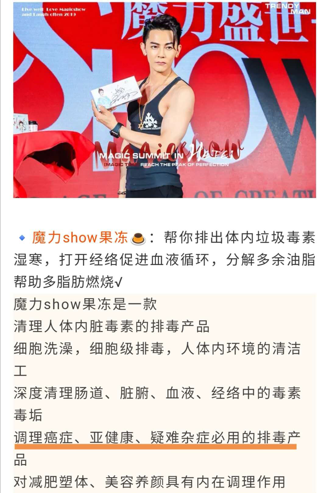 时间财经查阅该品牌微信公众号及经销商的宣传资料发现,魔力show相关产品有“瘦身、清理肠道、排毒、美容养颜”等功效,甚至有经销商宣传其产品有“调理癌症、亚健康、疑难杂症”的功效。