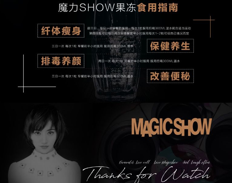 与众多微商品牌类似,魔力show在产品宣传上不遗余力。以魔力show果冻为例,其官网资料显示,魔力show果冻有“纤体瘦身、保健养生、排毒养颜、改善便秘”的功效。