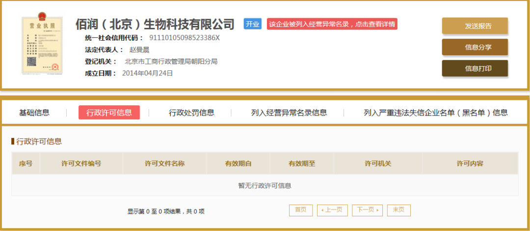 时间财经查阅天眼查发现,佰润生物工商登记信息上,并没有黄诚的信息。佰润生物成立于2014年4月24日,大股东赵曼晨持股70%,同时任公司法定代表人、经理和执行董事;小股东王军持股30%,任公司监事。2020年5月27日,该公司曾因“通过登记的住所或者经营场所无法联系”被北京市朝阳区市场监督管理局列入经营异常名录。