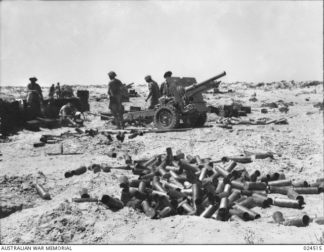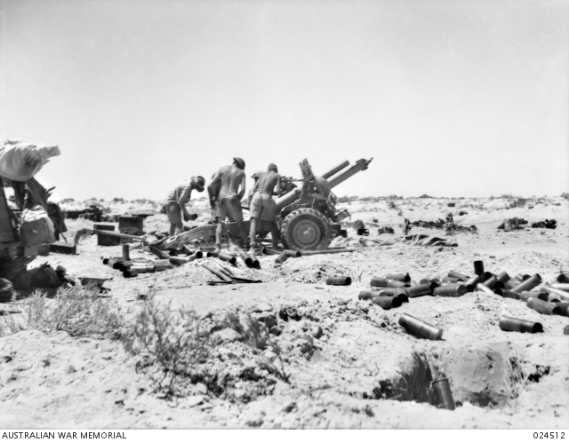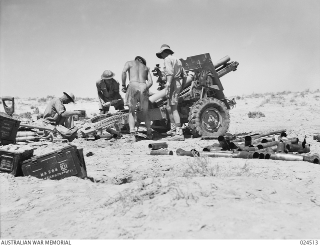 1942年7月在阿拉曼战役期间,澳大利亚第8野战炮兵团的炮手,装备了87.6毫米QF 25磅炮榴弹炮,看得出弹药十分充足。