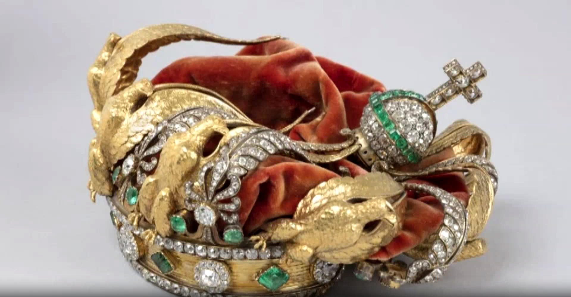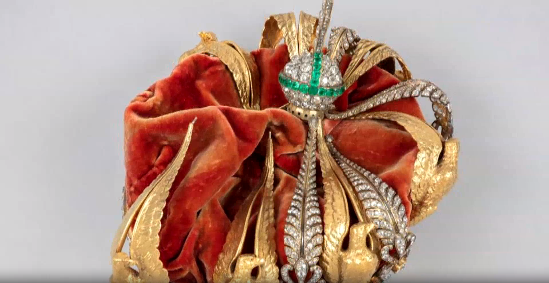 公告援引一份初步评估报告称,皇冠可能是从展柜豁口被强行取出时受到挤压,随后又遭猛烈撞击而使框架变形。原皇冠上有8只金鹰饰件和8组钻石与祖母绿构成的棕榈叶饰件交替排列,目前缺失1只金鹰饰件和约10颗底座周缘小钻。