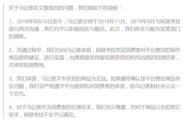 对此,网易考拉于5月30日官方回复称: