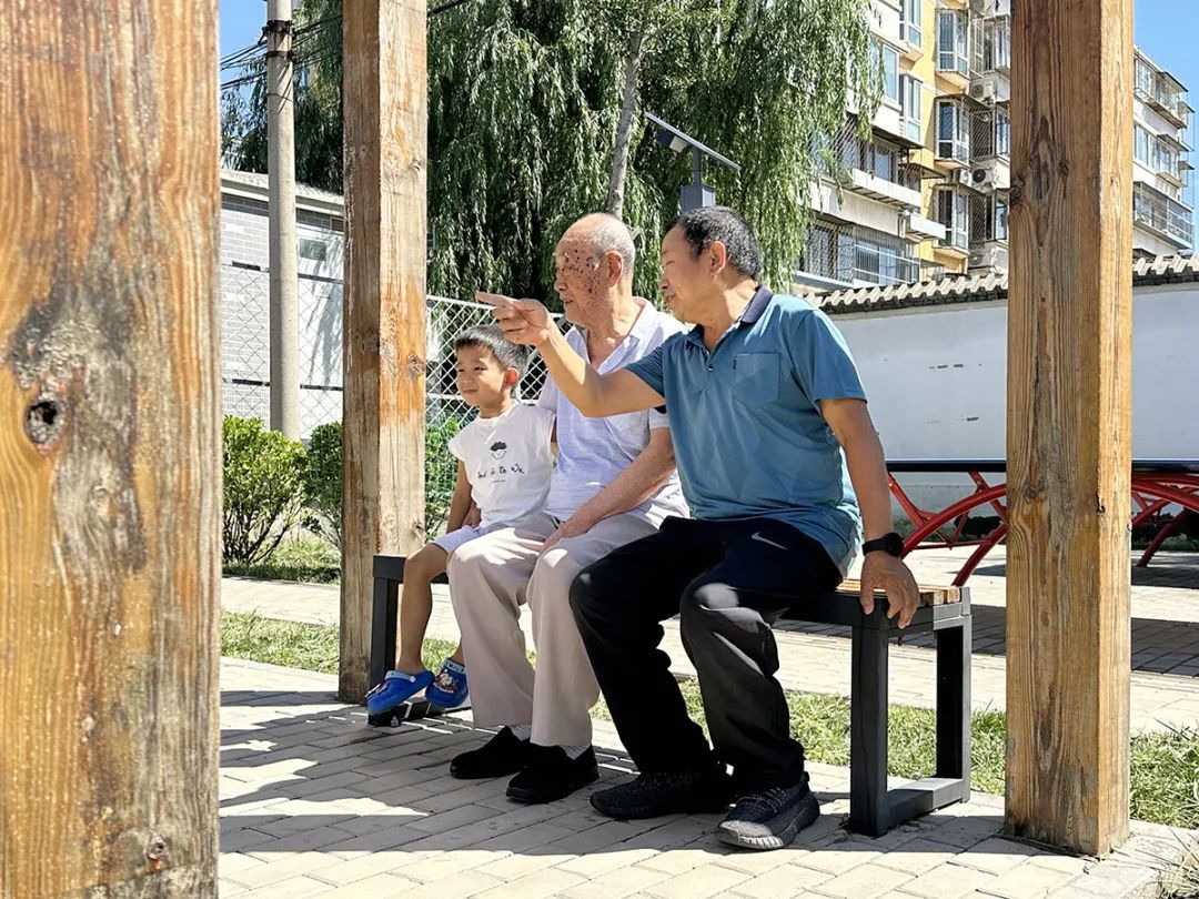 潘德清陪伴岳父和孙子在楼下遛弯儿。
